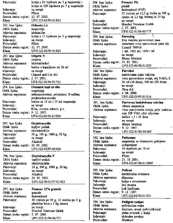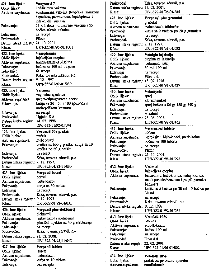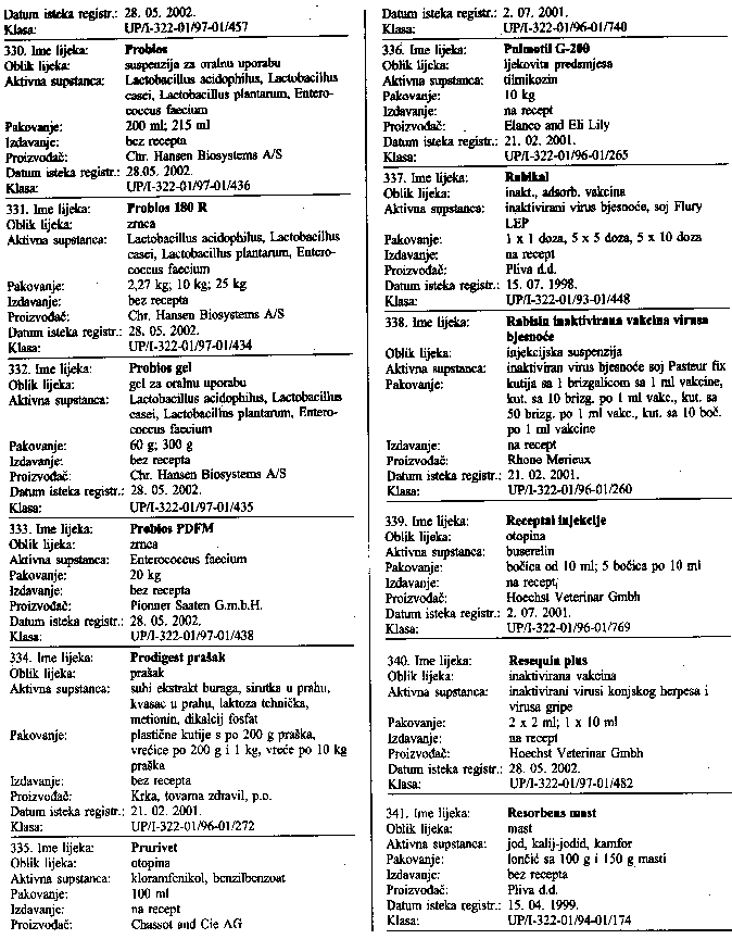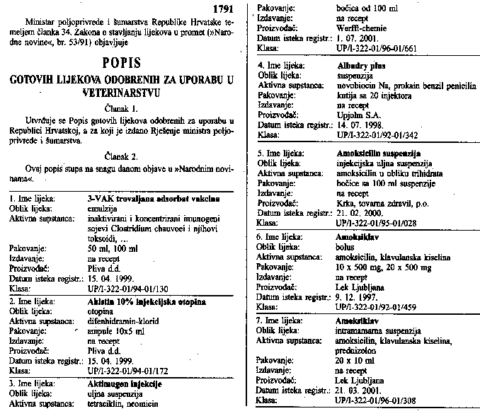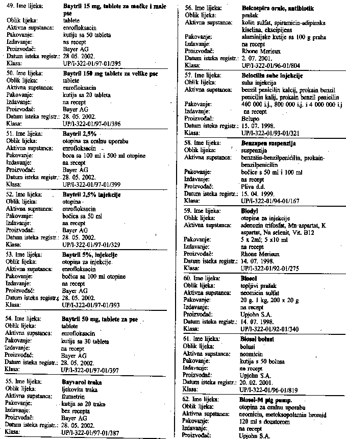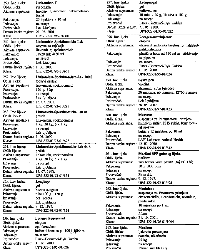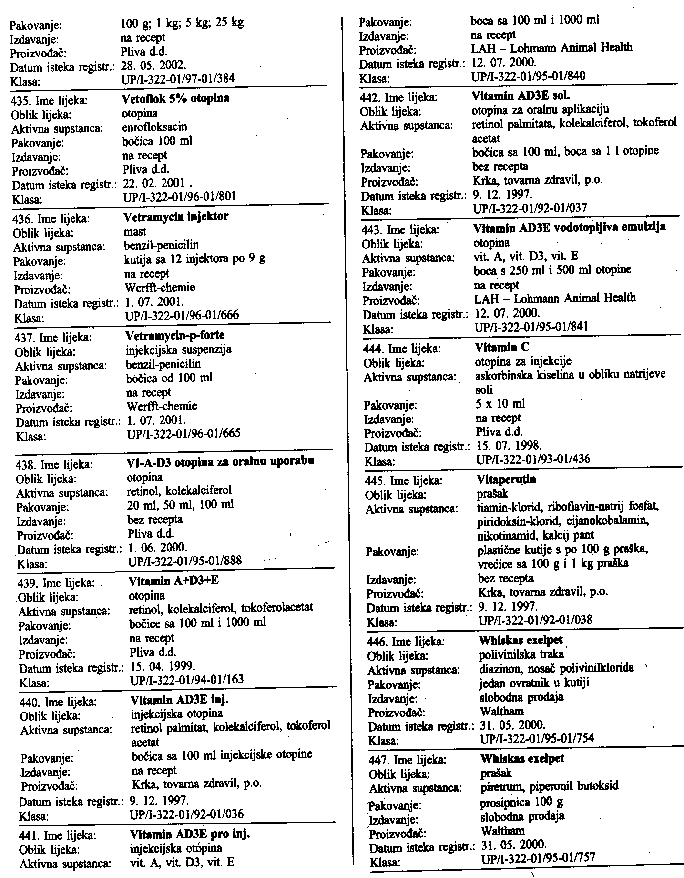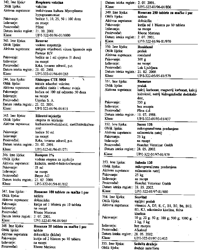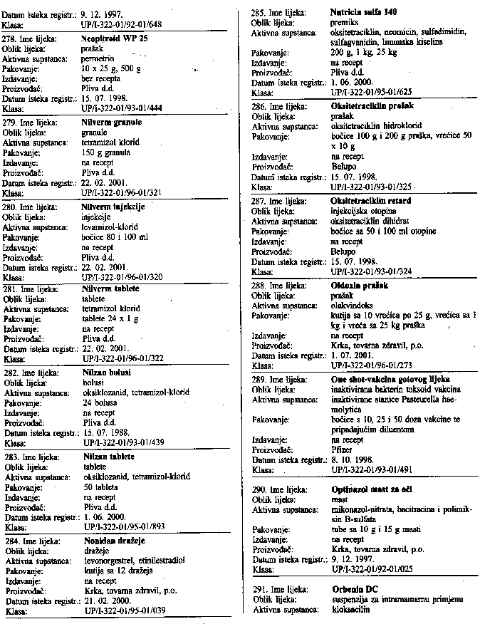 Popis gotovih liljekova odobrenih za uporabu u veterinarstvu (»Narodne novine«, br. 122/97)
