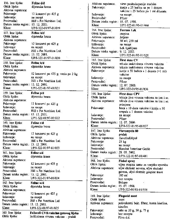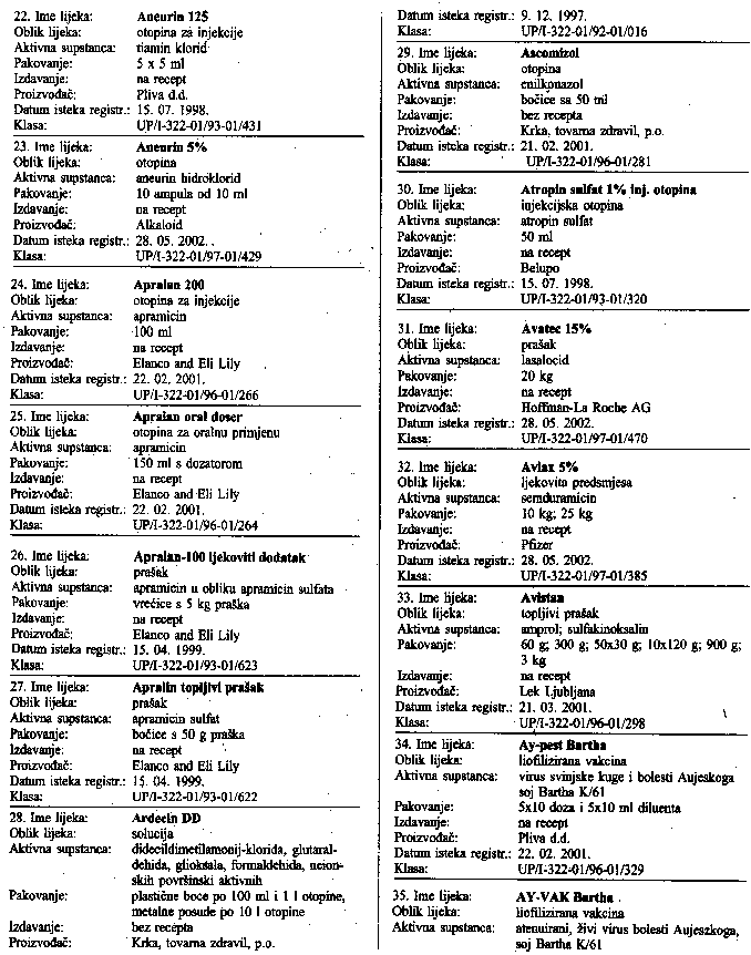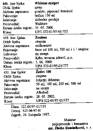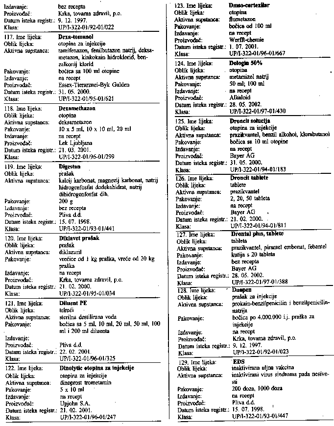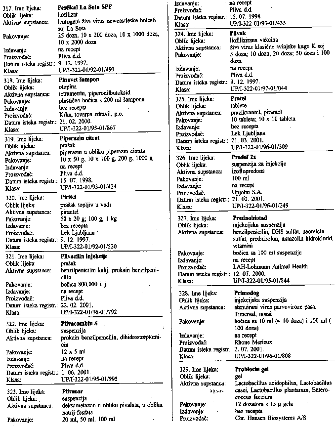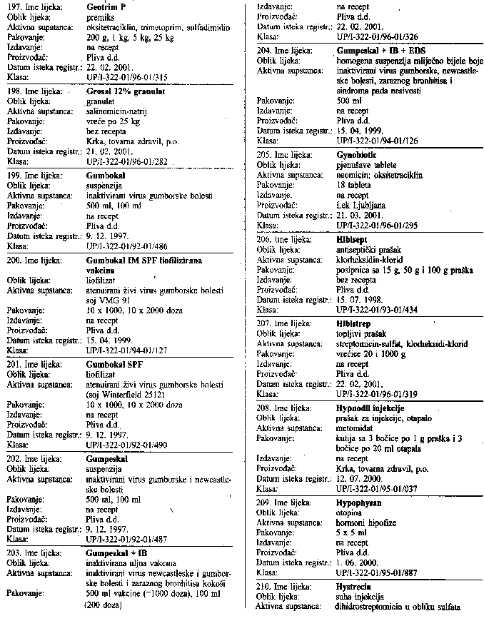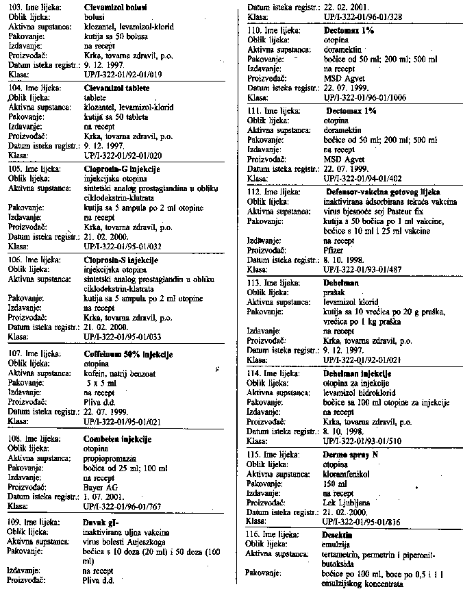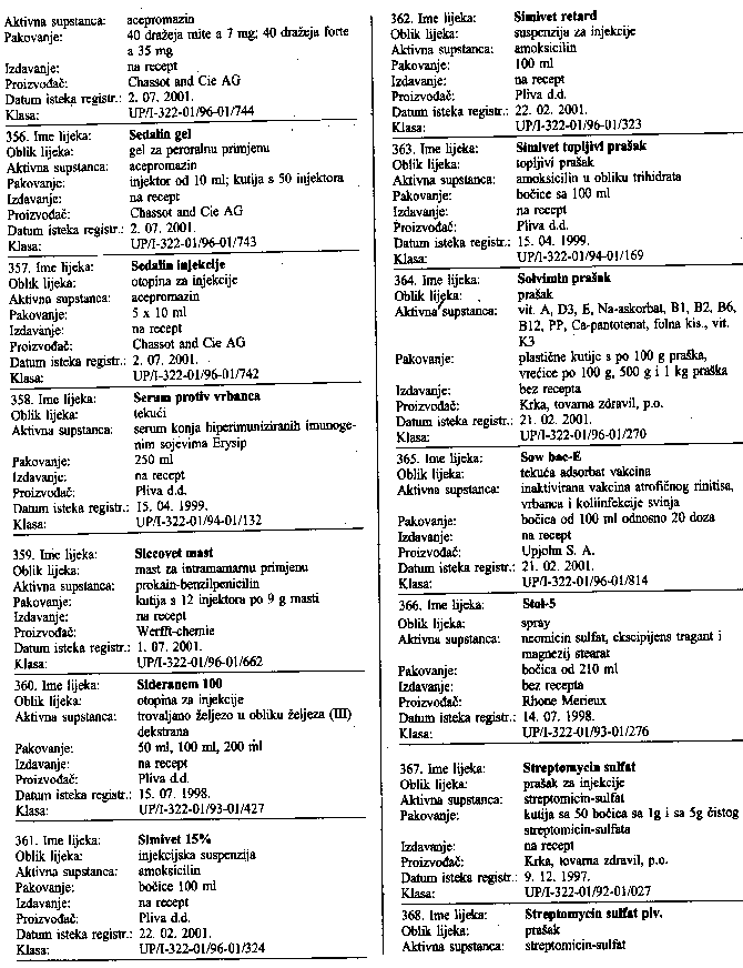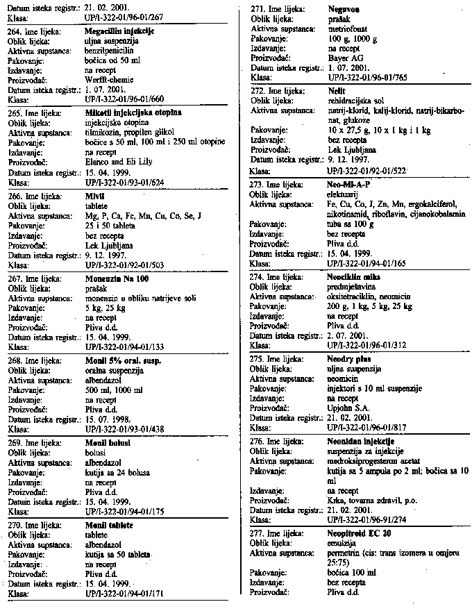 Popis gotovih liljekova odobrenih za uporabu u veterinarstvu (»Narodne novine«, br. 122/97)
