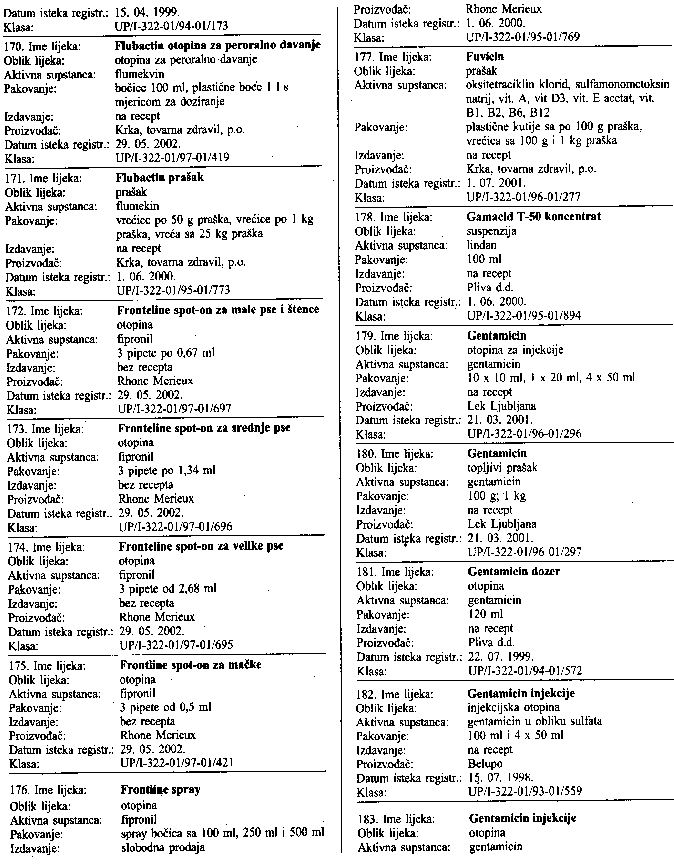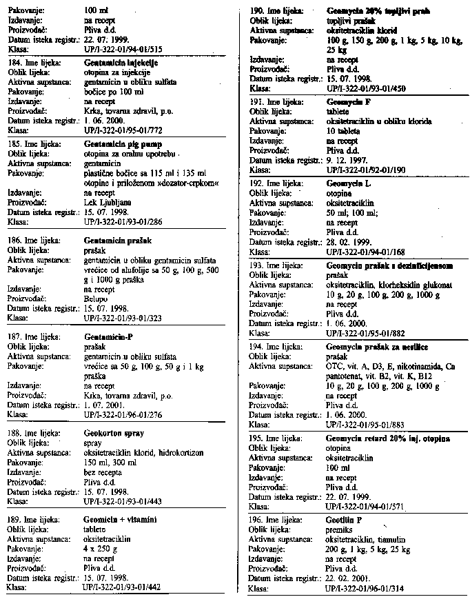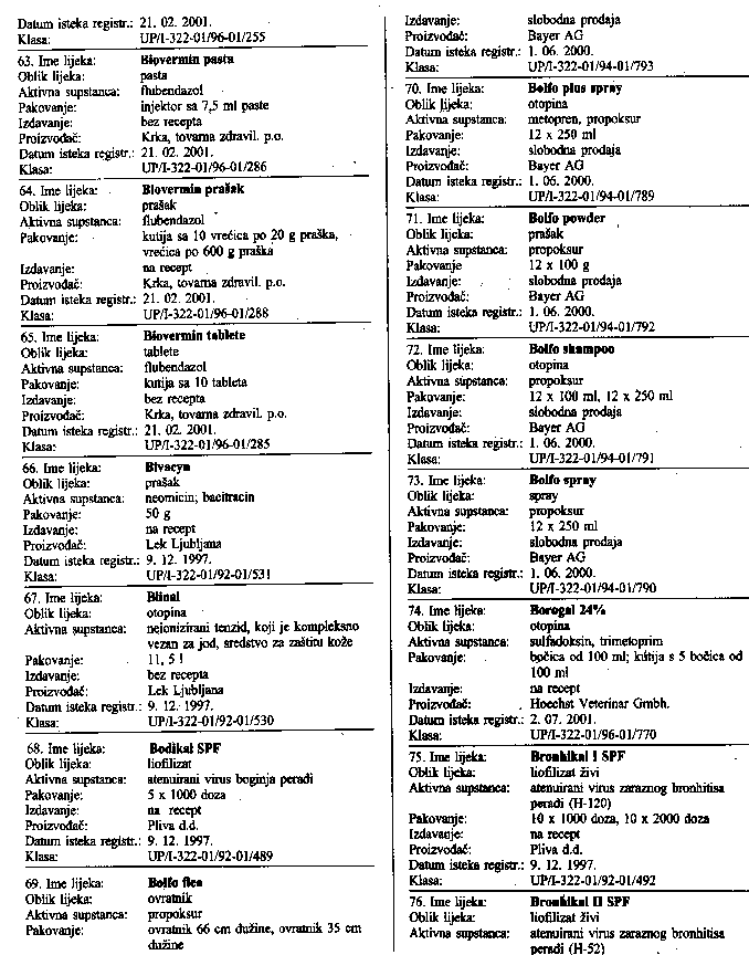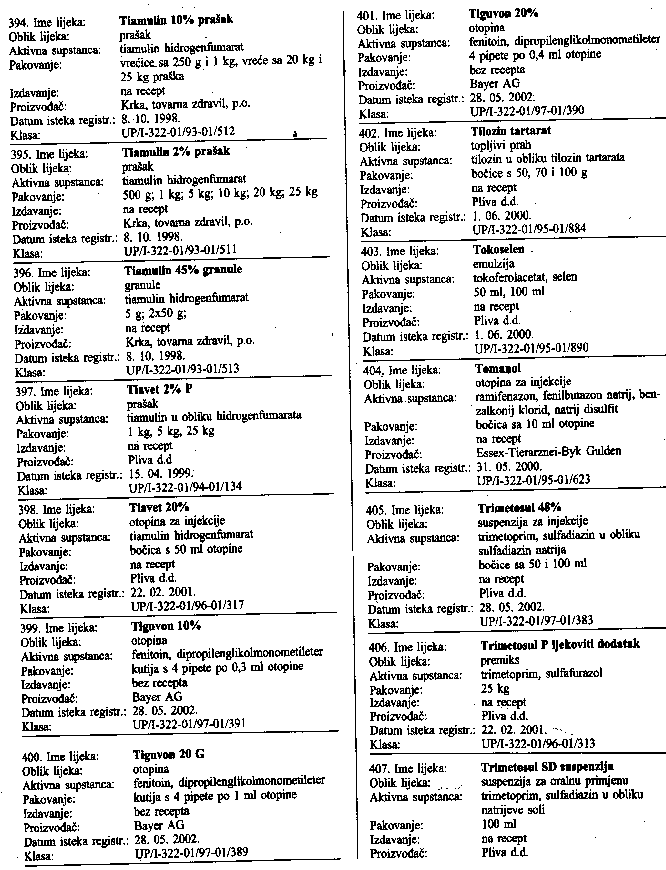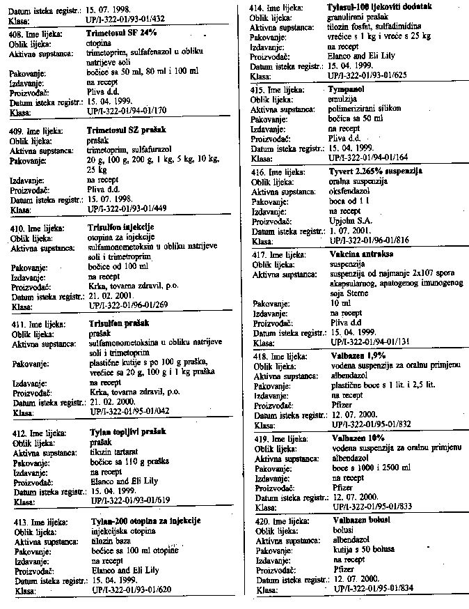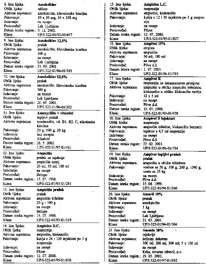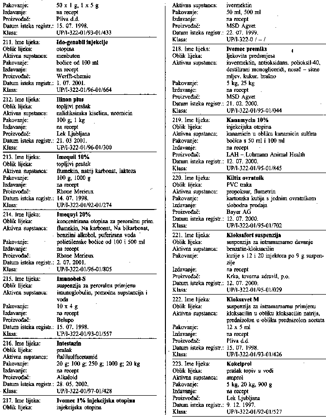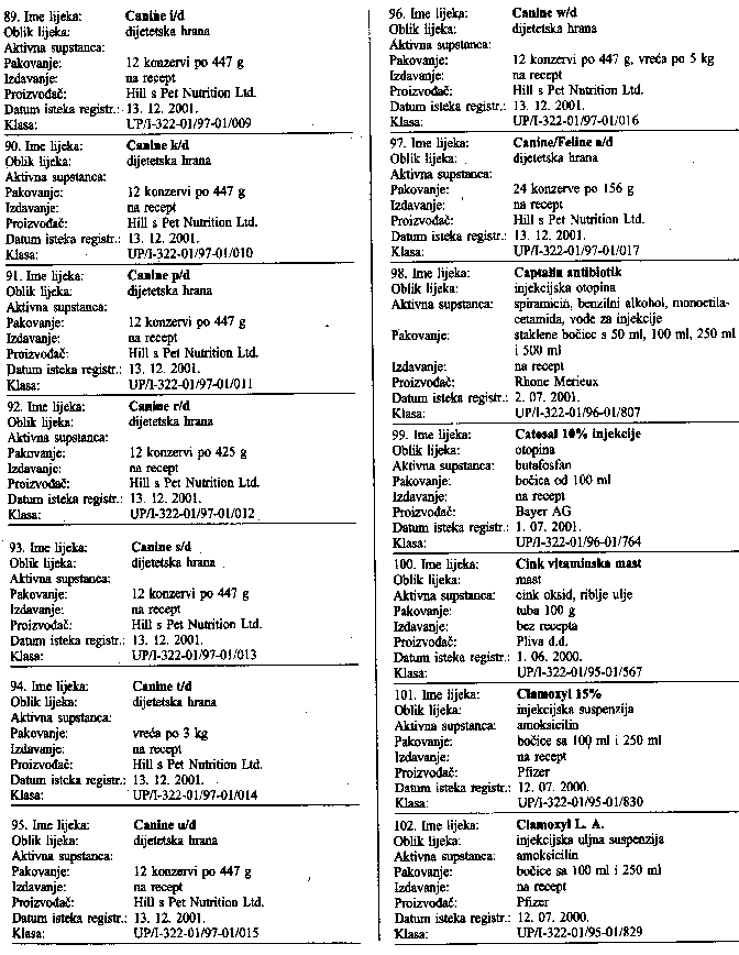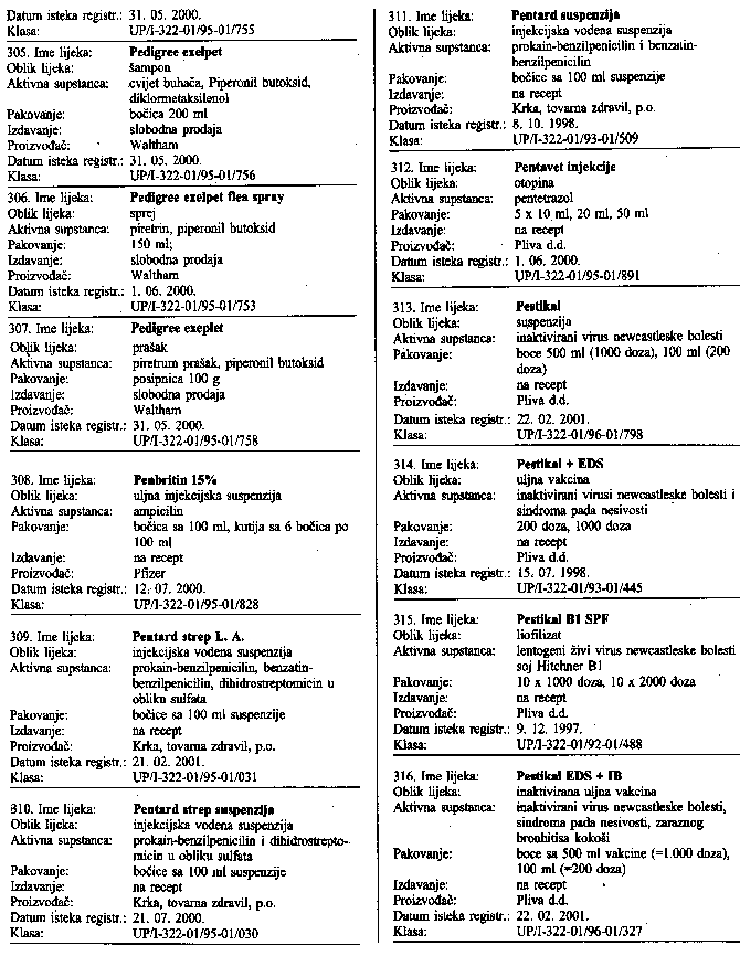 Popis gotovih liljekova odobrenih za uporabu u veterinarstvu (»Narodne novine«, br. 122/97)