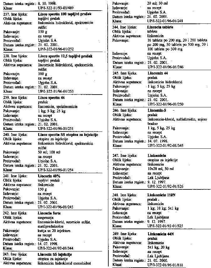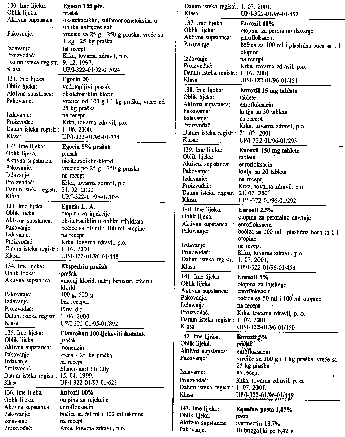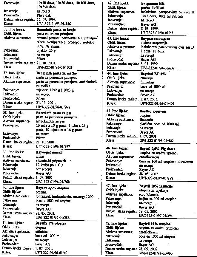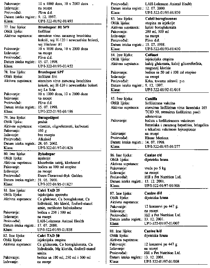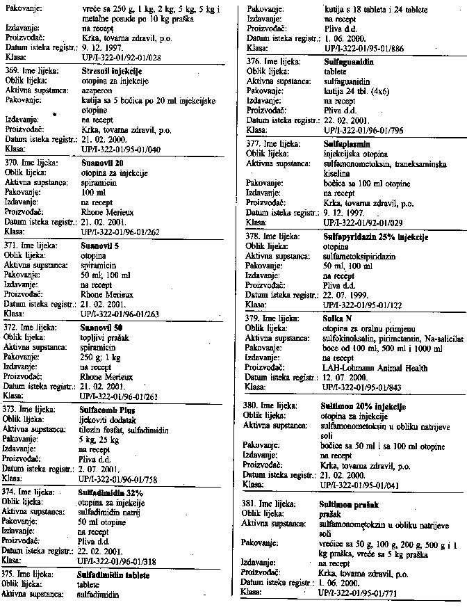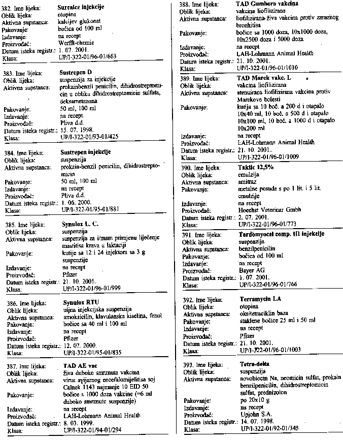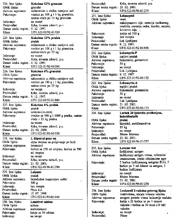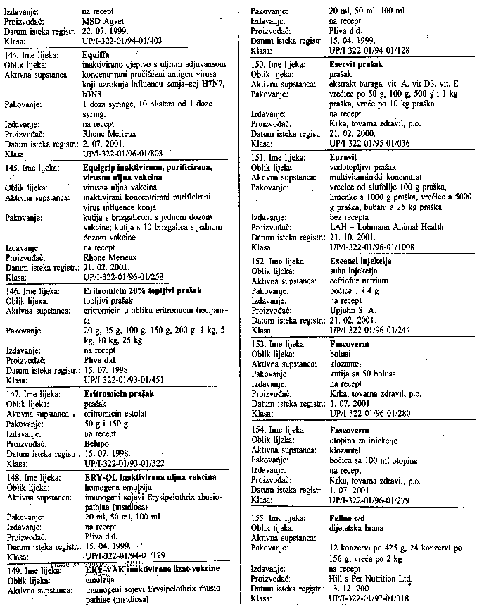 Popis gotovih liljekova odobrenih za uporabu u veterinarstvu (»Narodne novine«, br. 122/97)