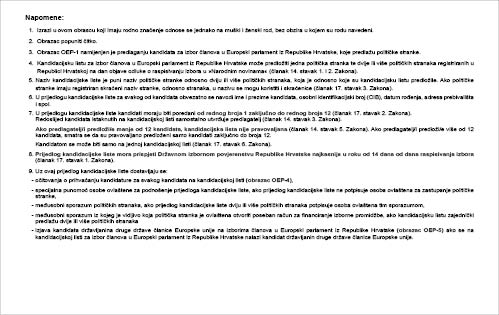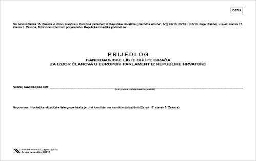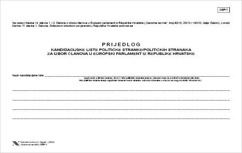 – OEP-1 – Prijedlog kandidacijske liste političke stranke/političkih stranaka za izbor članova u Europski parlament iz Republike Hrvatske,