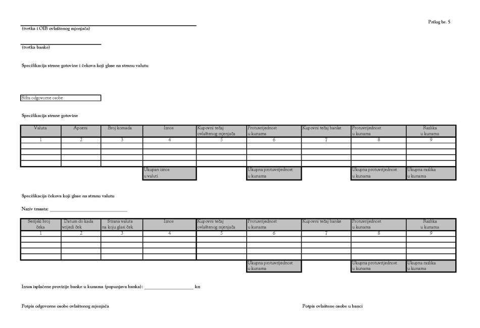 – »Specifikacija strane gotovine i čekova koji glase na stranu valutu« – Prilog br. 5