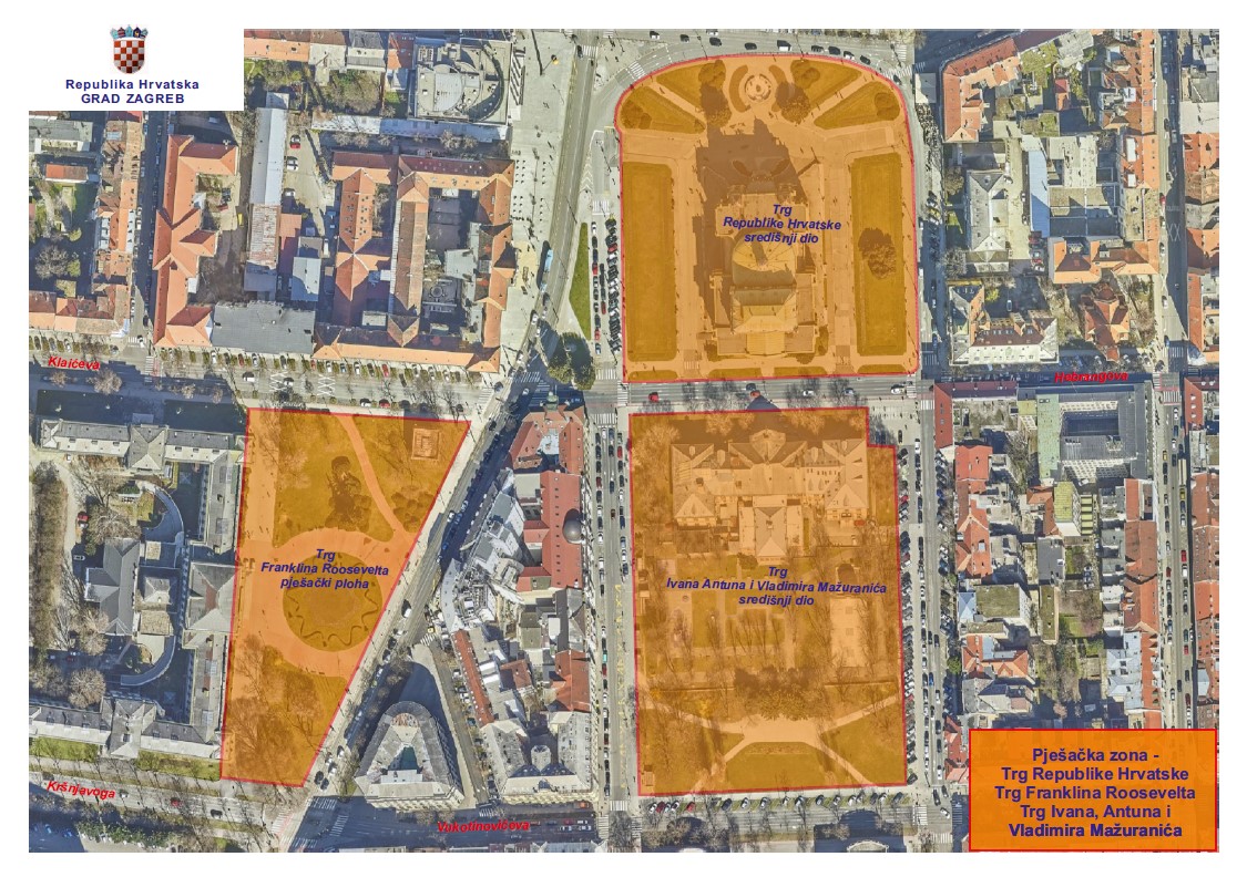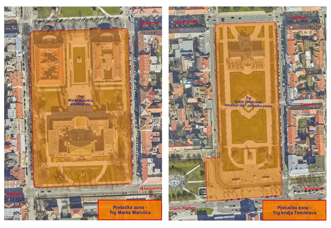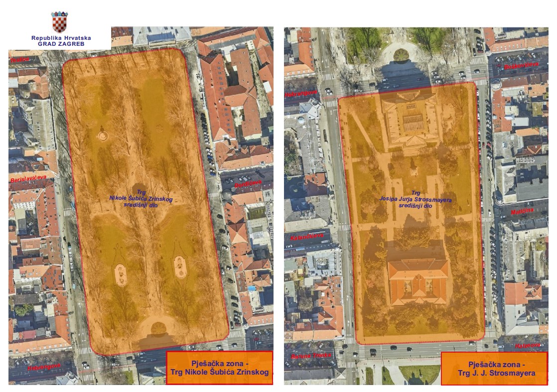 Pješačka zona određuje se i na središnjoj plohi na Trgu Nikole Šubića Zrinskog, Trgu Josipa Jurja Strossmayera, Trgu Marka Marulića, Trgu Antuna, Ivana i Vladimira Mažuranića, Trgu kralja Tomislava, Trgu Franklina Roosevelta, Trgu Republike Hrvatske, Trgu žrtava fašizma te Trgu Eugena Kvaternika.