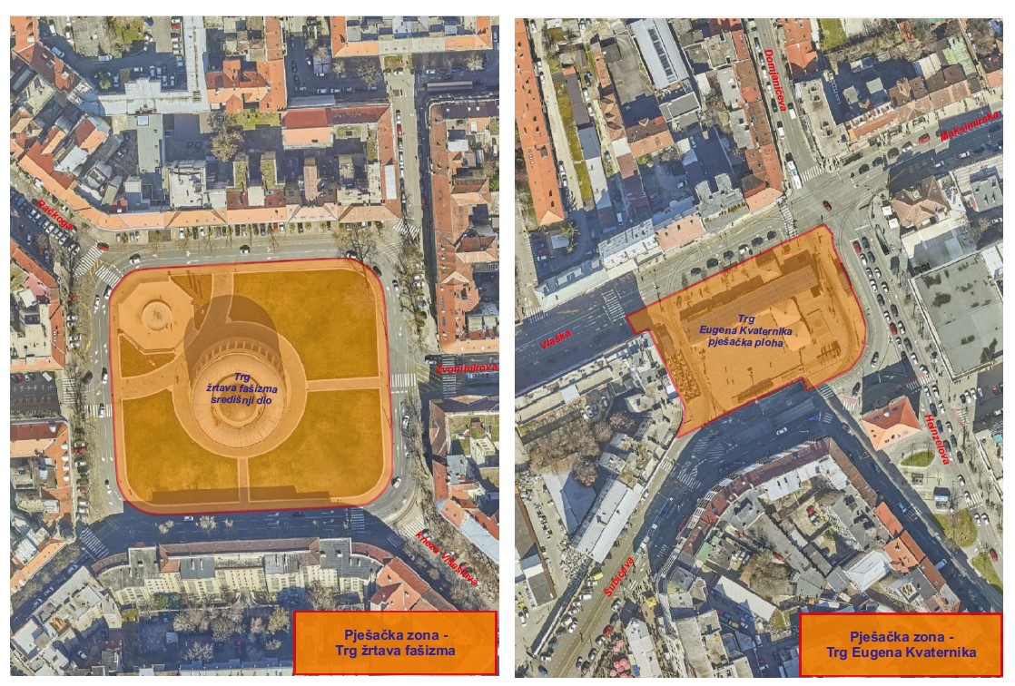 Pješačka zona određuje se na Trgu bana Josipa Jelačića, u Ilici od Trga bana Josipa Jelačića do Ulice Ivana Gundulića, u Ulici Josipa Eugena Tomića, u Ulici Ivana Dežmana, u Ulici Sv. Preobraženja, u Margaretskoj ulici, u Ulici Frane Petrića, u Ulici Ljudevita Gaja od Trga bana Josipa Jelačića do Ulice Nikole Tesle, u Praškoj ulici od Trga bana Josipa Jelačića do kbr. 5, na Trgu Petra Preradovića, u Ulici Mirka Bogovića, u Ulici Petra Preradovića od Trga Petra Preradovića do Berislavićeve ulice, u Masarykovoj od Gundulićeve ulice do Preradovićeve ulice, u Ulici Nikole Tesle od Ulice Petra Preradovića do Ulice Ljudevita Gaja, u Varšavskoj ulici od Trga Petra Preradovića do Ulice Ivana Gundulića, u Prolazu sestara Baković, u Ulici Nikole Jurišića od Trga bana Josipa Jelačića do Trga hrvatskih velikana, na Trgu hrvatskih velikana, u Ulici Janka Draškovića od Trga hrvatskih velikana do Vlaške ulice, u ulici Dverce, na Strossmayerovu šetalištu, u Ulici Pavla Radića od Trga bana Josipa Jelačića do Trga Braće Hrvatskoga zmaja, na Splavnici, u Ulici Ivana Tkalčića od Splavnice do Ulice Tome Mikloušića, u Kožarskoj ulici, na Mlinskim stubama, na Krvavom mostu, na Opatovini, u Skalinskoj ulici, u Bakačevoj ulici od ulice Pod zidom do Ulice Augusta Cesarca, u Ulici Augusta Cesarca, u Ulici Frana Kurelca, u Vlaškoj ulici od Bakačeve ulice do Palmotićeve ulice, od Palmotićeve ulice do Draškovićeve ulice i Petrinjskom ulicom od Trga bana Josipa Jelačića do Ulice Milana Amruša te u Ulici Vladimira Varićaka od kbr. 1 do 15 te kbr. 2 do 24, u Ulici Karela Zahradnika od kbr. 1 do 25 i do kbr. 2 do 34, na Trgu Ivana Kukuljevića od kbr. 1 do 7 i 8 do 14, na Trgu Dragutina Domjanića od kbr. 5 do 8, u ulici Stenjevec na dijelu od Samoborske ceste do Stenjevečke ulice.